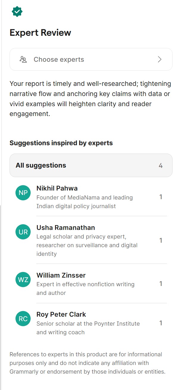 So the craziest thing happened a couple of days ago: Someone in my team was using Grammarly for an article they were writing, and it recommended me (Nikhil Pahwa) as an expert advisor for their article. It lists me by name, mentions that I’m the “Founder of MediaNama and leading Indian digital policy journalist”. This is a premium paid service.