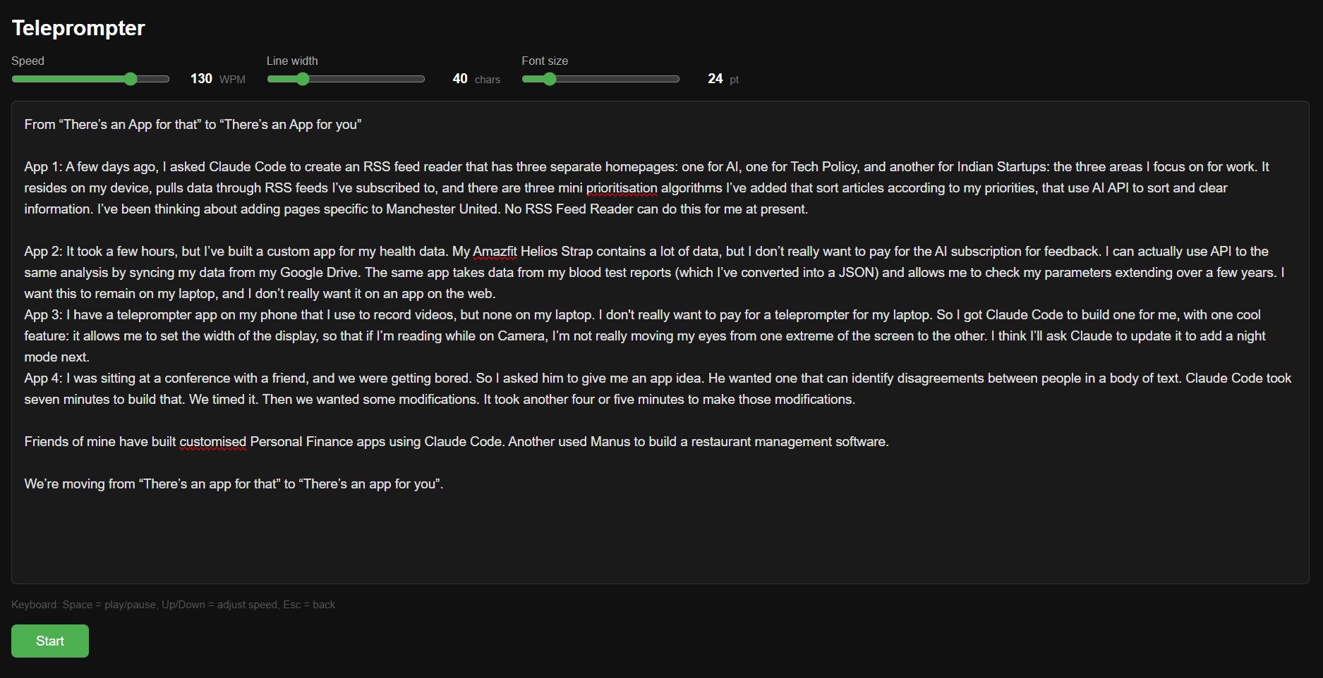 App 3: I have a teleprompter app on my phone for when I record videos, but none on my laptop. I didn’t want to pay separately for that, so I got Claude Code to build it, with an additional feature that allows me to set the width of the display.