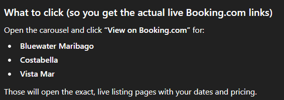 My experience: The ChatGPT app integration didn’t work well for me. Firstly, Chatgpt suffers from written diarrhea - too much noise compared to the native Booking.com app. Secondly, the recommendation engine isn’t functional: despite the Booking and Tripadvisor apps being available in the store, ChatGPT didn’t prompt a connection with either, and served up web links. Even after I manually connected Booking.con, ChatGPT prioritized generic web results over context from Booking. The Booking.com carousel was marginally useful: dates matched, but key filters like “beachfront” were ignored, and the options were too few to matter. Look at the disconnect between the recommendations and the carousel.